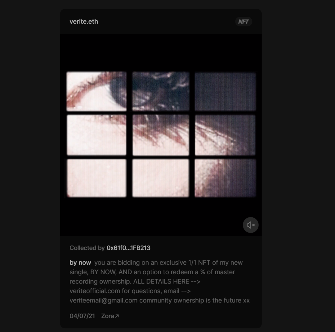 VRIT是一位独立艺术家,最近几个月一直活跃在加密领域——最近以 NFT 的形式将她的单曲“by now”的部分主唱片版税出售给了粉丝。也就是说,由于目前围绕版税支付的限制,收入分配必须通过传统的法律协议在链下而不是链上实施,NFT 仅充当歌曲顶部的经过验证的“购买收据”。Jacques Greene 的“Promise”NFT和Lil Dicky 的“Save Dat Money”NFT等其他拍卖也有类似的限制——即通过 NFT 拍卖版税股份,但实际上通过支付版税的传统音乐行业流程执行这些股份协议更慢。
