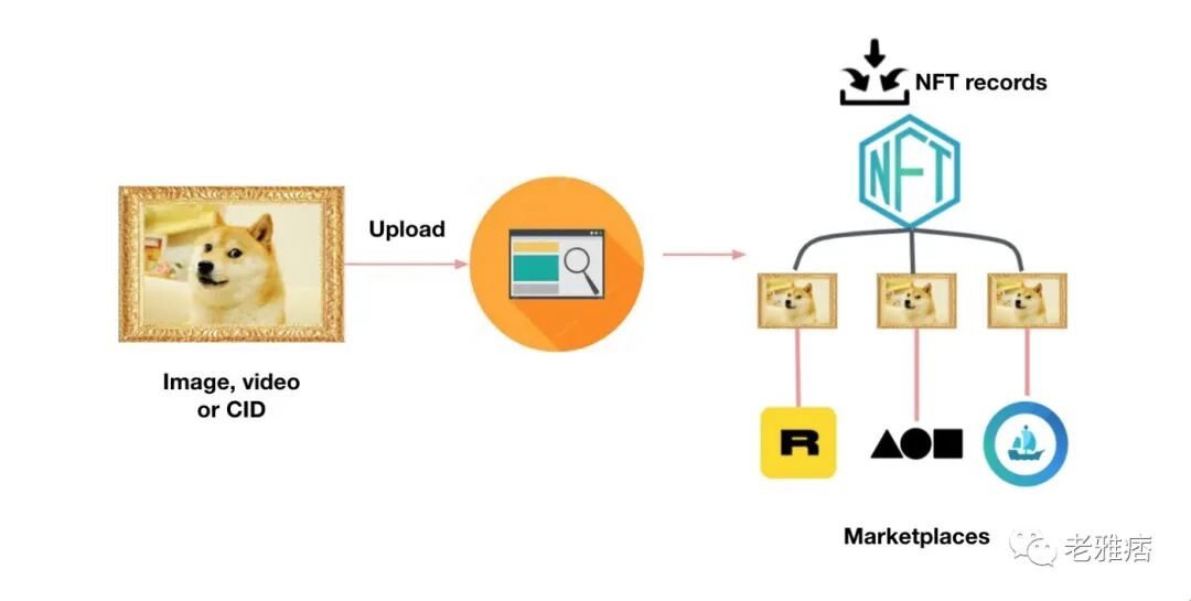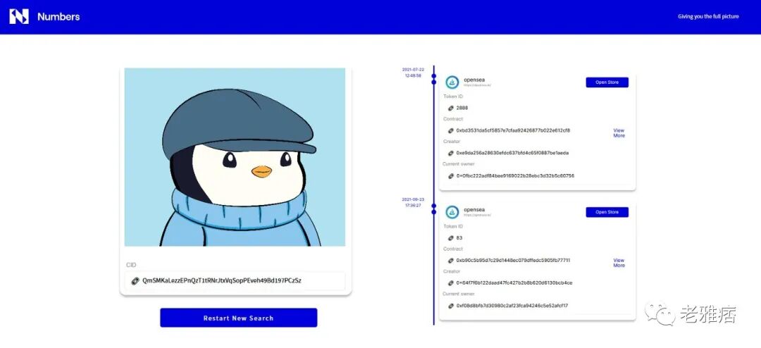 由于所有的NFT都存储在IPFS上,它们有一个唯一的标识符(CID)。这个CID是所有NFT搜索的起点。通过直接输入或直接从资产上传获取,NFT搜索引擎将解析其收集的NFT记录并输出搜索结果,包括谁mint的,谁是当前所有者,代币信息和NFT在哪个市场上市。