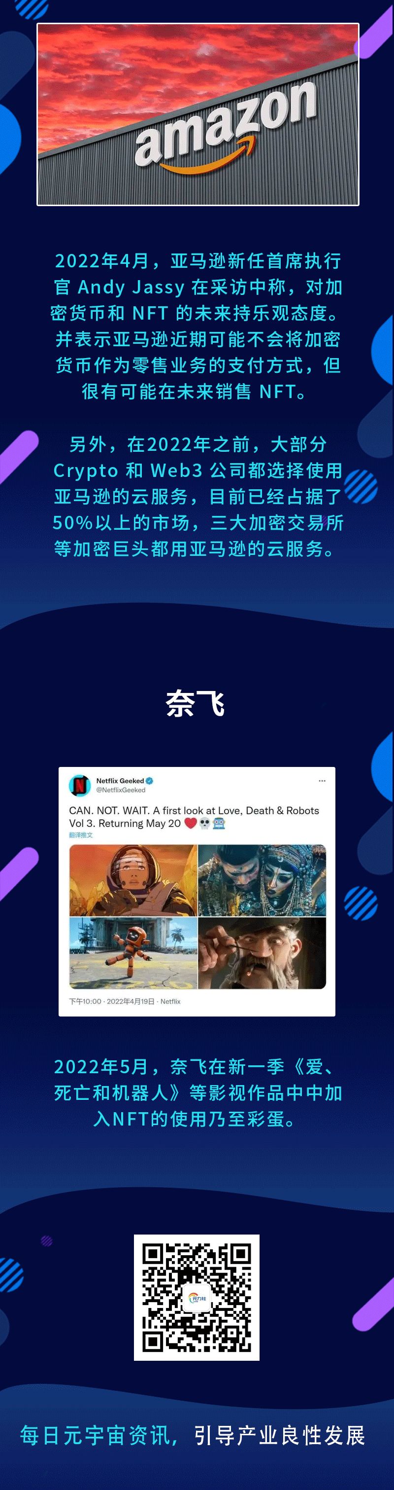 2022年4月,亚马逊新任首席执行官 Andy Jassy 在采访中称,对加密货币和 NFT 的未来持乐观态度。并表示亚马逊近期可能不会将加密货币作为零售业务的支付方式,但很有可能在未来销售 NFT。