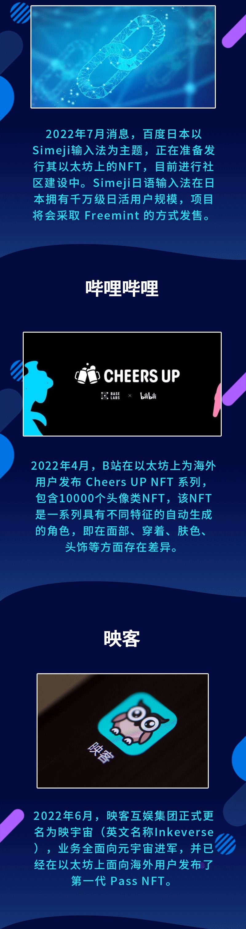 2022年7月消息,百度日本以Simeji输入法为主题,正在准备发行其以太坊上的NFT,目前进行社区建设中。Simeji日语输入法在日本拥有千万级日活用户规模,项目将会采取 Freemint 的方式发售。