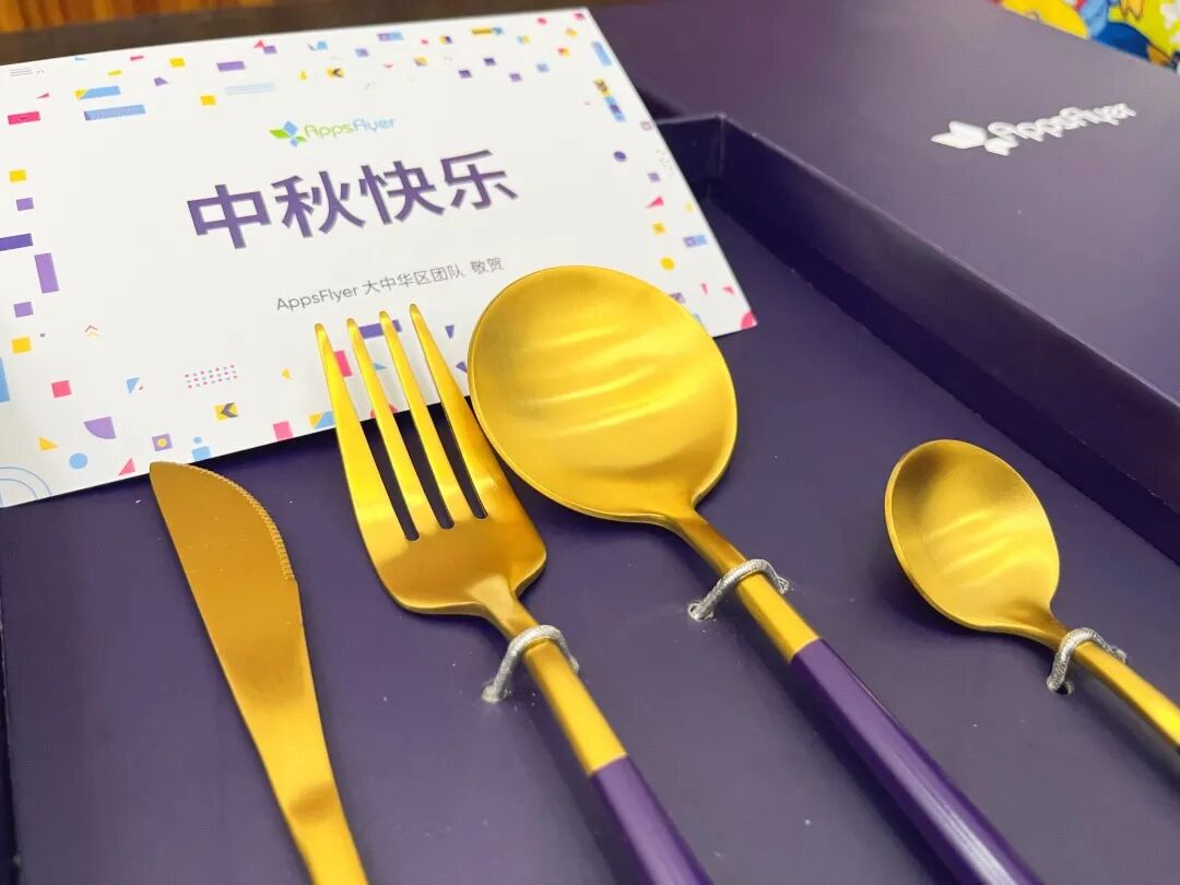 里面是一套餐具,紫金配色高贵也不落俗,很适合配起来吃一份葡萄香芋巧克力甜点呢。当然啦,还有AppsFlyer大中华区的中秋贺卡(贺卡也有数据感呢,不愧是做数据分析的!)