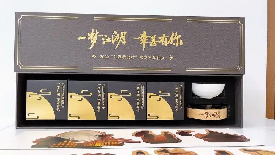 《一梦江湖》这一手月饼+茶杯+灯盏的“三件套”直接把中秋味拿捏得死死的。不仅这灯盏和礼盒十分适配,礼盒上烫金的八个字也十分潇洒,江湖味儿一下就有了。