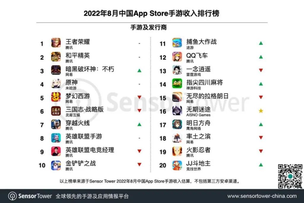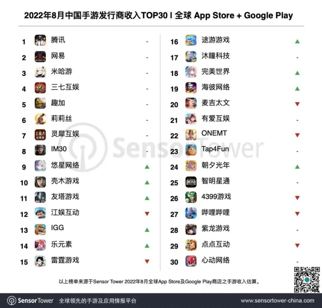在《幻塔》的带动下,8月腾讯游戏移动端收入环比增长2%;完美世界移动端收入增长34%,排名前进8位至第18名。
