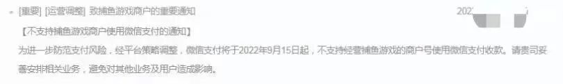 “为进一步防范支付风险,经平台策略调整,微信支付将于2022年9月15日起,不支持经营捕鱼游戏的商户号使用微信支付收款。”