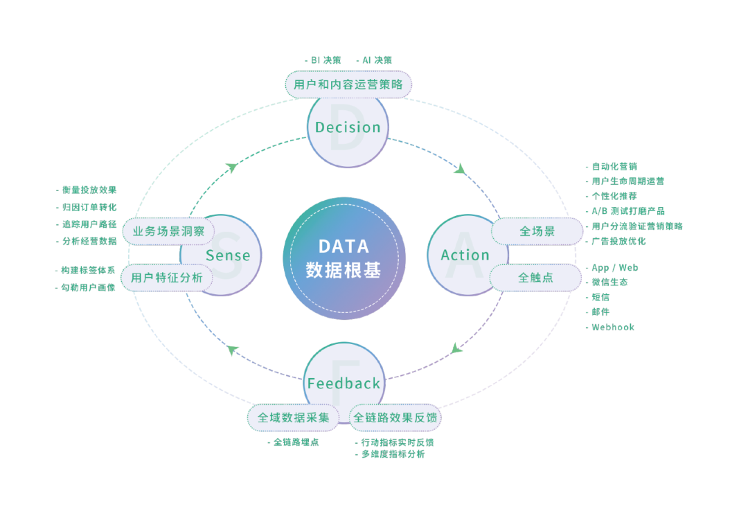 我自己做了一个抽象的模型,也是我们神策数据的基础方法论,叫 SDAF。任何一个企业的运转都是这四个环节:Sense,建立感知;Decision,做决策;Action,你的 Decision 要转化成 Action,如果不转化行动那就是光说不练;Feedback,你做了之后要有反馈,有了 Feedback,再形成新的 Sense。如此循环。企业在做数字化转型的时候,我认为在企业内部是需要构建这样一套数据闭环方法论的。当一个企业构建起这种闭环思维的时候,做的许多事都是能往前迭代的。