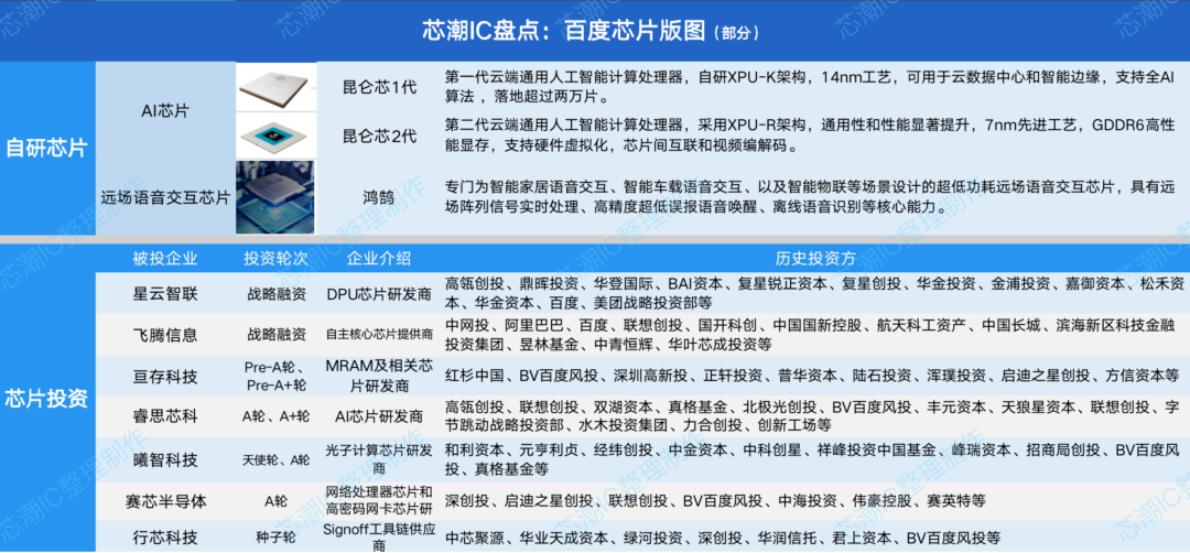 与此同时,百度还自研远场语音交互芯片“鸿鹄”,拓展算力服务。据悉,“鸿鹄”芯片瞄准智能家居、智能车载等物联场景,已在TCL智屏产品、小度音箱等产品上实现商用。而自研之外,百度对外投资多家芯片设计企业:DPU芯片研发商星云智联、自主核心芯片提供商飞腾信息、MRAM及相关芯片设计研发商亘存科技等。以前端设计为核心,百度的芯片版图正不断延展。