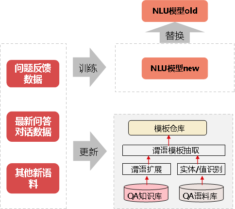 数字人收集用户反馈信息(投诉、回答错误反馈等)、新问题、新语料等数据,重新开始数据预处理、特征工程、模型训练等过程,即自我学习,其中模型训练依然使用前文提及的BERT、CRF等算法获得新NLU模型,定时对原模型进行更新,并重新部署。在部署过程中如遇效果不如原模型的情况,则会启动回滚模式,回滚到上一版本NLU模型(见图5)。