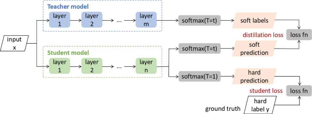 模型蒸馏采用Teacher-Student迁移学习方法(见图4),将Teacher模型的性能迁移到Student模型上,因Teacher模型网络更为复杂,具有良好的泛化能力,可以用它学习到的soft knowledge来指导Student模型的学习,使得参数量更少、更简单的Student模型也能够具备与Teacher模型相近的学习能力。