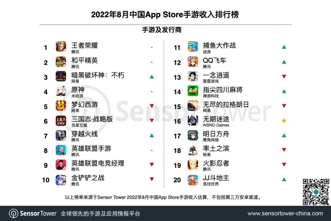 近日,Sensor Tower商店情报平台公布了8月国产手游厂商的全球收入排行榜。