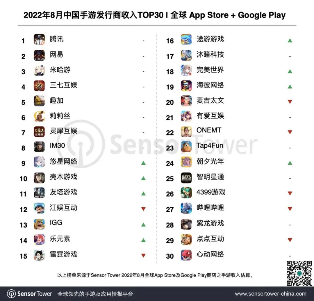 8月国产手游厂商全球收入排行榜,腾讯仍然是冠军