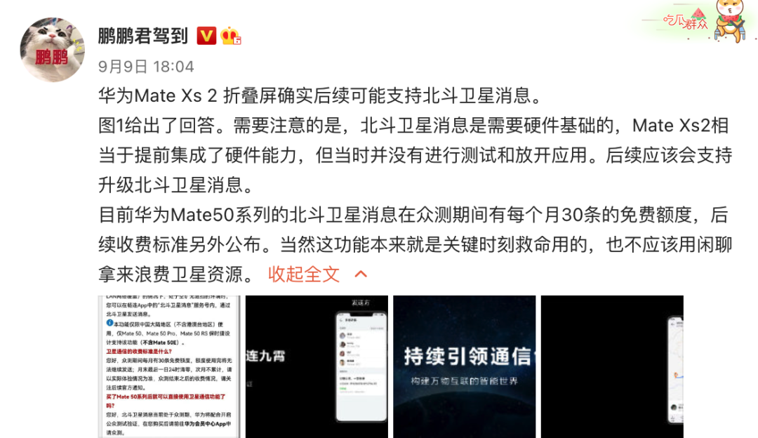 据悉,全新的华为Mate50系列提供了Mate50、Mate50 Pro、Mate50 RS保时捷设计、Mate50 E共四款机型,并带来了多方面的全新旗舰级别支持。官方消息显示,这次的全新旗舰产品华为Mate50系列支持北斗卫星消息硬件能力,是业界首款支持北斗卫星消息的大众智能手机。当身处荒漠无人区、出海遇险、地震救援等无地面网络信号覆盖环境下,可通过畅连APP将文字和位置信息向外发出,与外界保持联系,并支持多条位置生成轨迹地图。不过,随着Mate50系列的正式发布,不少用户也开始关注起了这一全新功能的更多细节。目前,关于这些内容华为也给出了官方介绍。据悉,华为Mate50系列的北斗卫星消息功能不需要插入SIM卡,即可在无地面网络信号覆盖的环境通过卫星网络对外联系。在手机无信号(无蜂窝网络/WLAN网络覆盖)的情况下,处于空旷无遮挡的环境时,可以在畅连App中的“北斗卫星消息”服务号内,通过北斗卫星发送消息。不过,卫星通信仅支持在畅连App中发送卫星消息,暂不支持上网/通话/视频功能。众测期间每月限额免费使用,额度使用完将无法继续发送。需要注意的是,接收方需要在有地面网络覆盖的环境下才可以接收北斗卫星消息。如果接收端手机已安装并激活支持北斗卫星消息的畅连App版本,则可以同时接收到畅连消息和短信消息;如果接收端手机未安装畅连App,则只能接收到短信消息。至于具体的功能支持机型方面,华为官方表示当前仅华为 Mate 50、 Mate 50 Pro、Mate 50 RS 保时捷设计支持通过北斗卫星网络发送消息,暂不支持通过北斗卫星网络接收消息。不过,与此同时也消息称,该功能后续或许还将覆盖至华为旗下的其他机型,并陆续出现了相关爆料。近日,博主@鹏鹏君驾到 在爆料中提到,“华为Mate Xs 2 折叠屏确实后续可能支持北斗卫星消息。”“需要注意的是,北斗卫星消息是需要硬件基础的,Mate Xs2相当于提前集成了硬件能力,但当时并没有进行测试和放开应用。后续应该会支持升级北斗卫星消息。”按照爆料中提到的说法,目前在售的华为Mate Xs 2 折叠屏旗舰有望在后续支持该功能。此外,这次的华为Mate50全系搭载骁龙8+ 4G,而最新的消息则显示其有可能会获得5G手机壳的支持。博主@厂长是关同学 在最近的一份爆料中提到,“华为Mate50系列的5G手机壳也快来了,大概10月左右。”就这份爆料中提到的信息来看,能够为华为Mate50系列提供5G支持的手机壳产品有望在下个月到来,感兴趣的用户可以保持关注。当然,鉴于暂时还没有确切的官方消息出现,实际的产品情况如何还有待验证。