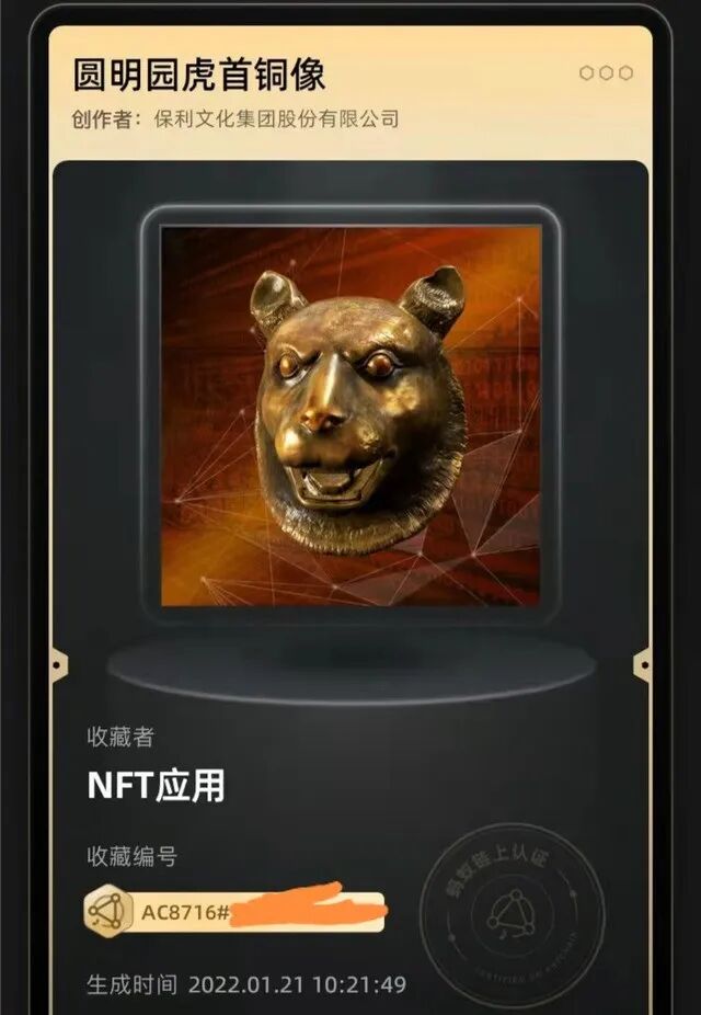 当时群友们都说鲸探的“十二生肖”文物系列比较值钱,印象很深的是当时我抢到了其中公认最好的一款,保利发行的国宝级文物圆明园虎首铜像。
