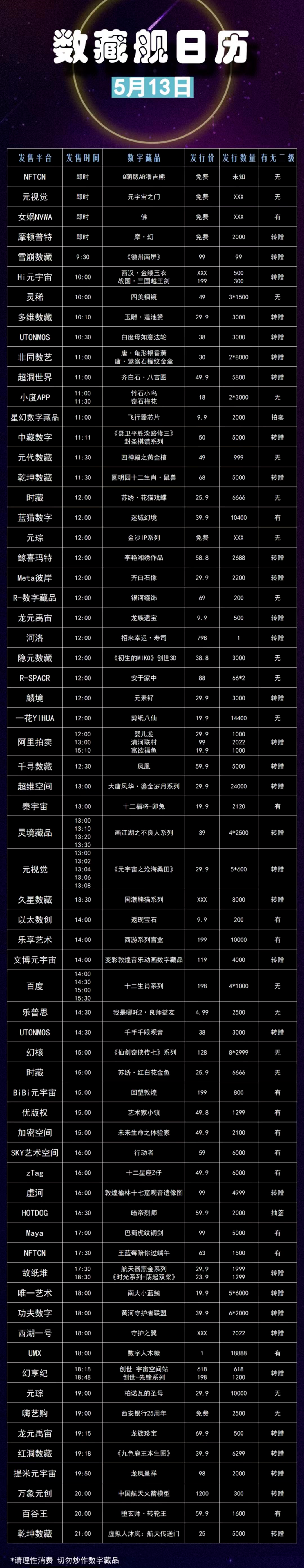 数藏舰5月13日统计的当天发售日历