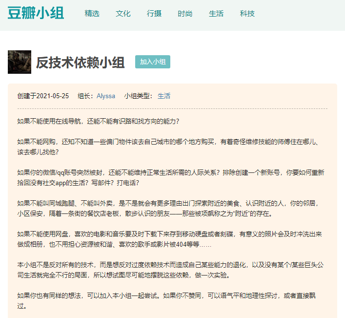 最近在刷豆瓣时,无意中发现了“反技术依赖小组”和“数字极简主义者小组”等有趣的组织,小组里大家都在倡导降低对现代科技的依赖,减少智能手机的使用,尤其是那些看一眼就能“偷走”你几个小时的APP。