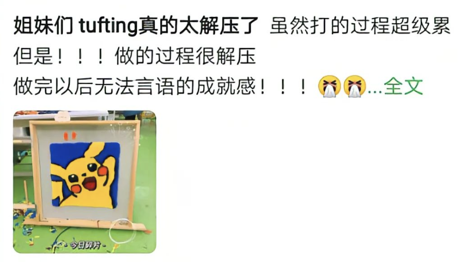无论是当初爱玩剧本杀的,还是酷爱户外运动的朋友,统统都拿起突突枪对着布板,做起了毛茸茸的 Tufting。你可能早就听过 Tufting,因为今年北上广的 Tufting 新店开爆了,不时就有一家新店开张。小红书上最新的生活方式趋势——「轻解压」,让 Tufting 作为其趋势下的新宠,又再度被热议起来。如果你还只是听说过 Tufting,没有试过Tufting,这次我们带你一文了解它的来龙去脉。它是一种原本只会出现在工厂里,用来制作地毯的簇绒工艺。几坨毛线、一把簇绒枪、一块布板,在老师的指导下,不需要你多有天赋就能快速上手。只要你挑选好自己喜欢的图案,接着就用投影起稿进行描绘。最费劲的只有突突突这个步骤了,十分废手,一幅制作下来可能大半年都不想要再踏进 Tufting 店。不过它胜在能够满足自己的成就感,即便成品歪歪扭扭,也不妨碍拍张照发上社交平台。如今只要在 Ins、TikTok 搜索 Tufting ,就会发现上 10 个博主有 8 个都在分享自己的 Tufting 作品,就连明星也在紧跟起潮流。没尝试过的朋友,是不是很好奇,为什么 Tufting 可以打败成功「剧本杀」,让当代年轻人统一化身为「扎男扎女」?继续往下看,看完这篇赏心悦目的文章,或许你就会 get 到 Tufting 的魅力了。Tufting 起源于 19 世纪的美国,超过了百年历史,只是早就进化成机制工艺,现在纯手工制作的已经少之又少。如果问 Tufting 是如何掀起热火朝天全民皆「扎」的景象。在此之前,阿根廷艺术家 Alexandra kehayoglou 就为 Dries Van Noten 2015 春夏时装系列创作了一幅长达 50 米的地毯。耗时一个半月,这幅以莎翁的《仲夏夜之梦》为创作灵感的 Tufting ,实在治愈。直到 2018 年,纤维艺术家 Tim Eads 通过簇绒枪制作地毯、包包感受到了这项手艺所带来的「快感」,所以那段期间,他开始建立了 Tufting 社区,在 Ins 上收获大量点赞。Tufting 在 Tim Eads 坚持不懈的传播下,越来越多的艺术家纷纷加入了这个行列。抽象派 Trish Andersen ,将各种错落有致的织物进行结合,传达了以时间为主题的色彩魅力。她的 Tufting 作品和别人的不同,Nina K Ekman 更擅长立体制作。柔软的织物仿佛瞬间支棱了起来,自然界的各种植物,都被她搬进了家里。同样热爱大自然的视觉艺术家 Claude Como ,则是把 Tufting 当作「墙面挂画」。强烈的颜色对比却完全不失簇绒的柔软感,不得不说,她的作品具有很强的艺术装饰效果。Tim Eads 从留言中也发现很多人对簇绒工艺兴趣度极高,为此他在社区上还分享了制作教程,甚至慢慢地售卖起器材。每个人都是「艺术家」,Tim Eads 认为对于没有接触过 Tufting 的人来说,在短时间里,只要有合适的工具,就能制作出一件艺术作品,实现自己的创作梦。不过 Tufting 和其它手艺一样,都需要一定的技术门槛。这也让众多商家看到的商机,选择线下手工坊体验,容错率更高。整个过程需要耗时几个小时,还有老师时刻指导,手工氛围直接拉满了。用一把簇绒枪,在布板上钩织出自己心仪的图案,创作自由度极高。不管是地毯、抱枕还是包包,都能任你操作,即便是小白手残党也可以几分钟就掌握。Tufting 属于「私人定制品」再加上本身色彩就很丰富出片率极高,更是直接拿捏了当代年轻人的拍照需求。这项门槛较低的活动,让所有人享受到创作和手工的快乐,同时还获得了成就感,现在预约 Tufting ,都得提前几周了。或许有很多人都疑惑,Tufting 如此废手,为什么热度还这么高?首先是在视觉解压,我们所看到的 Tufting 作品,大部分色彩饱和度都很高,眼睛得到了愉悦。其次是材质解压,簇绒的主要组成就是一团团线球,它天生自带「舒适」属性,让人很想触摸。除了外在条件给予的解压感,Tufting 还有从心理上释放压力的作用。如果你去线下体验过便知,虽然突突突占据了 Tufting 80% 的时间。大多数顾客去到店里,只需挑选出喜爱的图案,相当于是有了底稿,根本不用自行创作。当你专注于填色这件事情,就会在这段时间忘掉外界的嘈杂。疫情持续反复的时间里,无论是谁都需要释压,而突突突又像是把压力打进了布板里,帮助消除。手工活向来就能够给人带来仪式感和成就感,同时压力得以释放。自我展示、社交需求和释放压力统统兼得,在这种多重满足的加持下,也是 Tufting 风靡的主要原因。打开小红薯,输入「解压」, Tufting 必定是近段时间的热门关键词。但只要你往下划动就会发现,原来年轻人一直都没有变。125w 篇笔记琳瑯满目,他们总是在找寻能够释放、得以放松的活动。不少人会观看解压视频「小刀刮香皂、修马蹄、洗地毯」,如果以第一视角拍摄的,播放量更是猛增,因为有代入感,好似是自己在操作,压力得到解放。豆瓣上还有一个小组,叫做解压方式研究会,里面的压力研究员多不胜数。成员们表示,像当初捏泡泡、解压馆砸东西那些发泄式的方法,已经不足以满足了。收集现在总总解压方式,便可以看出,剧本杀慢慢淡出的原因,是如今的年轻人在闲暇时间里,更愿意选择一些不用动脑的活动。大家更喜欢「有意义感」、亲身沉浸式的解压方式,就比如 Tufting ,通过一些细水长流的动作去慢慢舒缓。有在周末把化妆品一样样按列别归纳整理的,也有跟着视频教程制作出好看的冰块。线下还流行过制香,称出合适的香粉、搅拌、熔蜡,每一步都得自己一一调配,这个的耗时更长,成就感更高。发条被拧紧的年轻人,在被压力无情挤压后,拥抱起不同的解