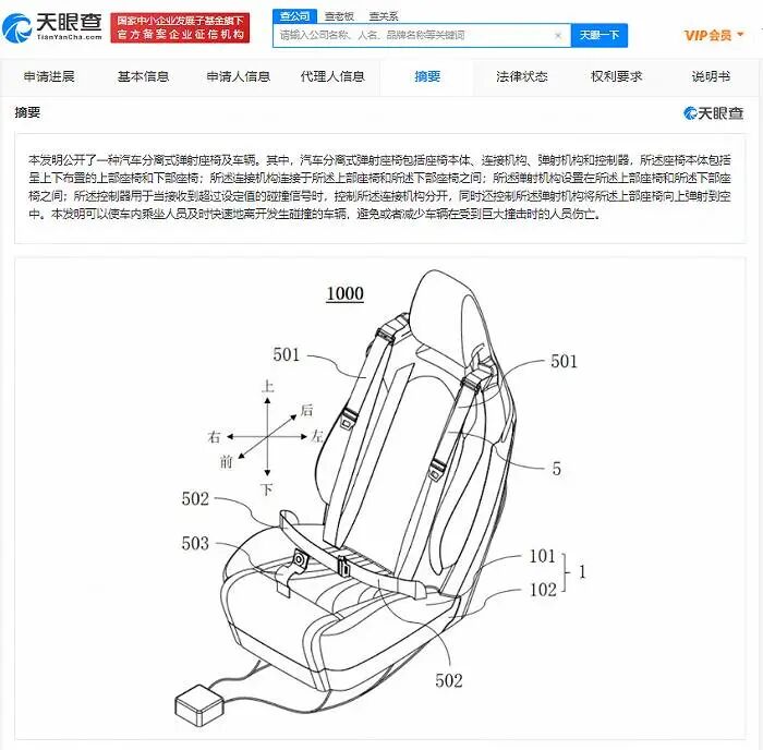 天眼查 App 显示,9 月 6 日,奇瑞汽车股份有限公司申请了「汽车分离式弹射座椅及车辆」专利公布。专利摘要显示,汽车分离式弹射座椅包括座椅本体、连接机构、弹射机构和控制器。当控制器接收到超过设定值的碰撞信号时,将分开连接机构,同时还会控制弹射机构将座椅向上弹射到空中。奇瑞表示,这一发明可以使车内乘坐人员及时快速地离开发生碰撞的车辆,避免或者减少车辆在受到巨大撞击时的人员伤亡。所以,一键把副驾弹射出去是能够实现的对吗?![]()