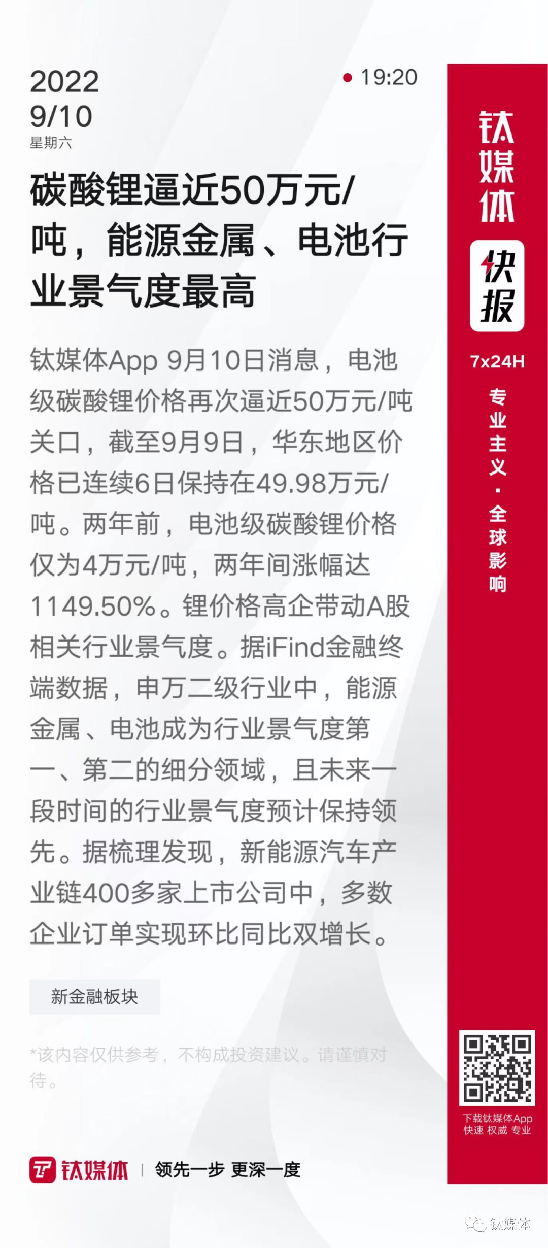 【碳酸锂逼近50万元/吨,能源金属、电池行业景气度最高】