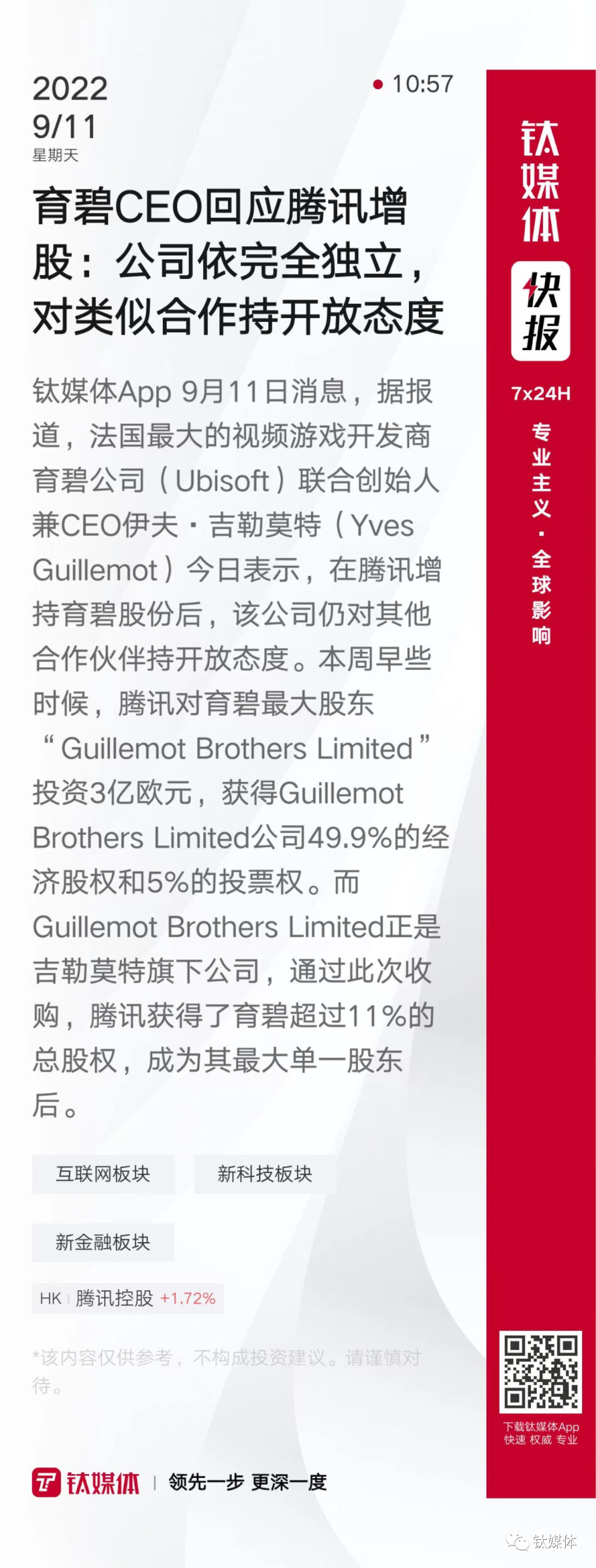 【育碧CEO回应腾讯增股:公司依完全独立,对类似合作持开放态度】