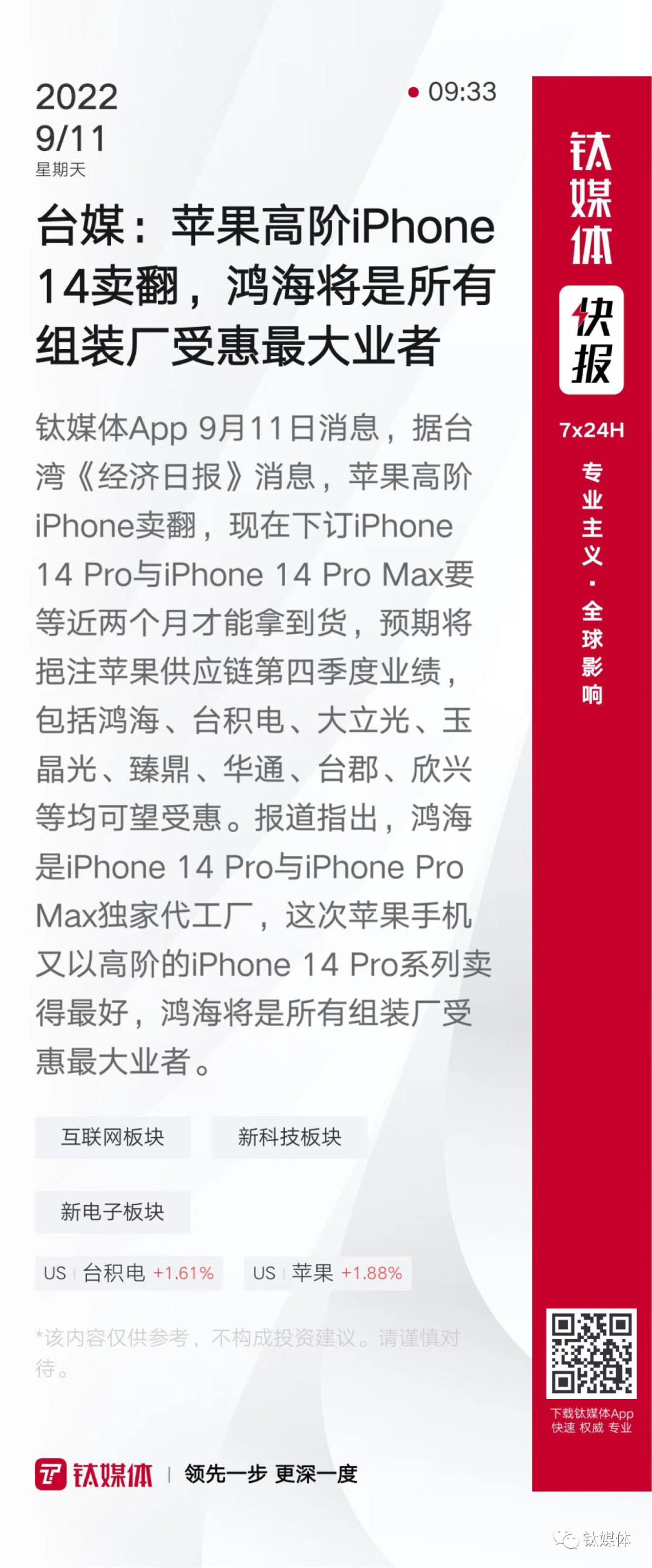 【台媒:苹果高阶iPhone 14卖翻,鸿海将是所有组装厂受惠最大业者】