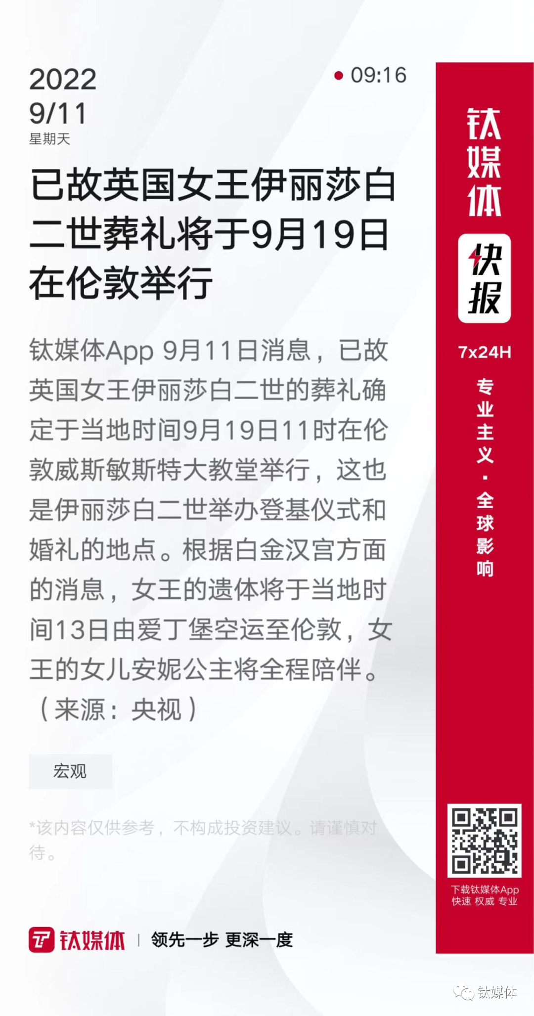 【已故英国女王伊丽莎白二世葬礼将于9月19日在伦敦举行】