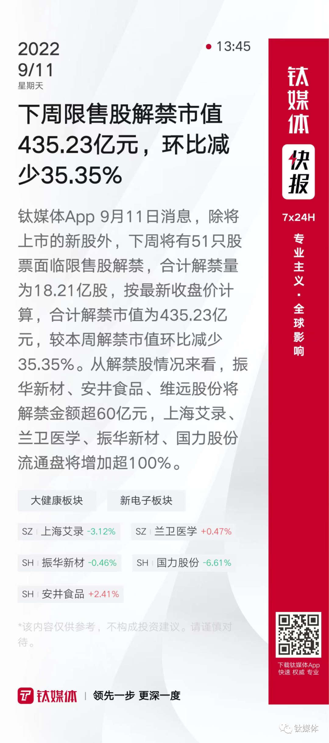 【下周限售股解禁市值435.23亿元,环比减少35.35%】