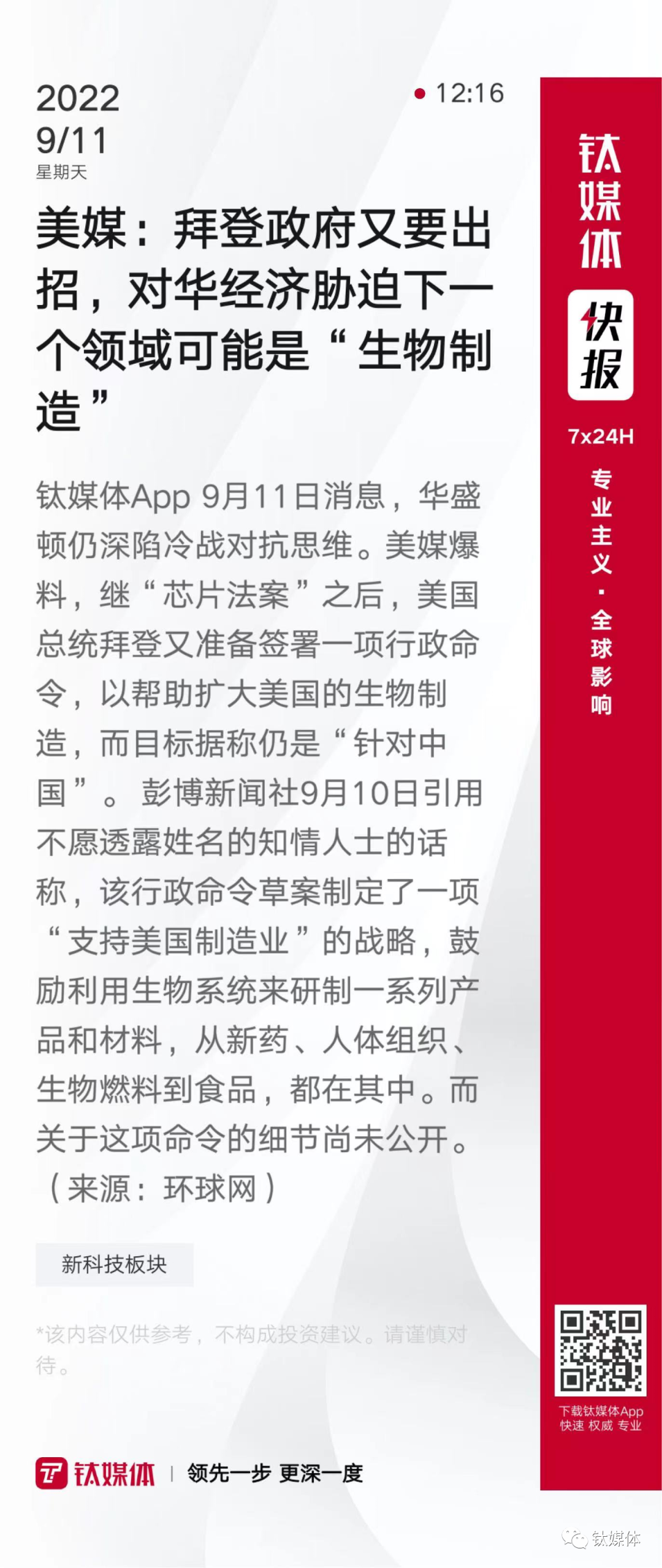 【美媒:拜登政府又要出招,对华经济胁迫下一个领域可能是“生物制造”】