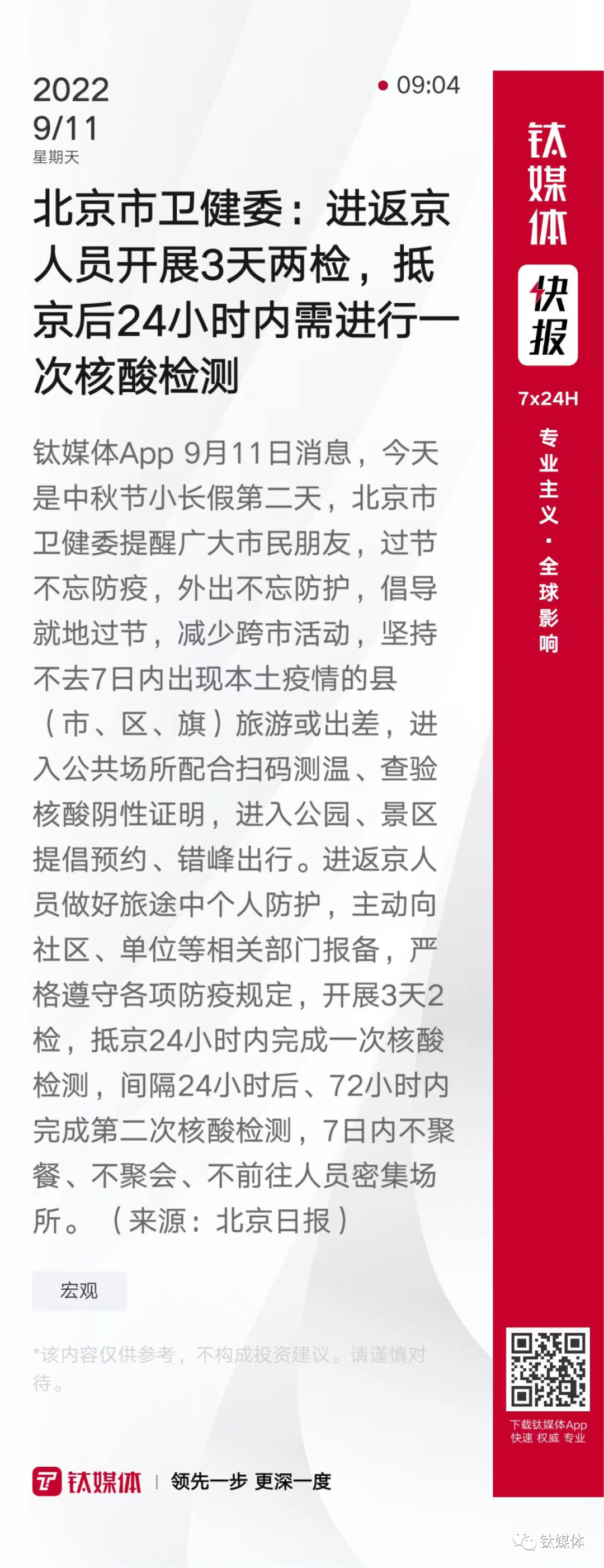 【北京市卫健委:进返京人员开展3天两检,抵京后24小时内需进行一次核酸检测】