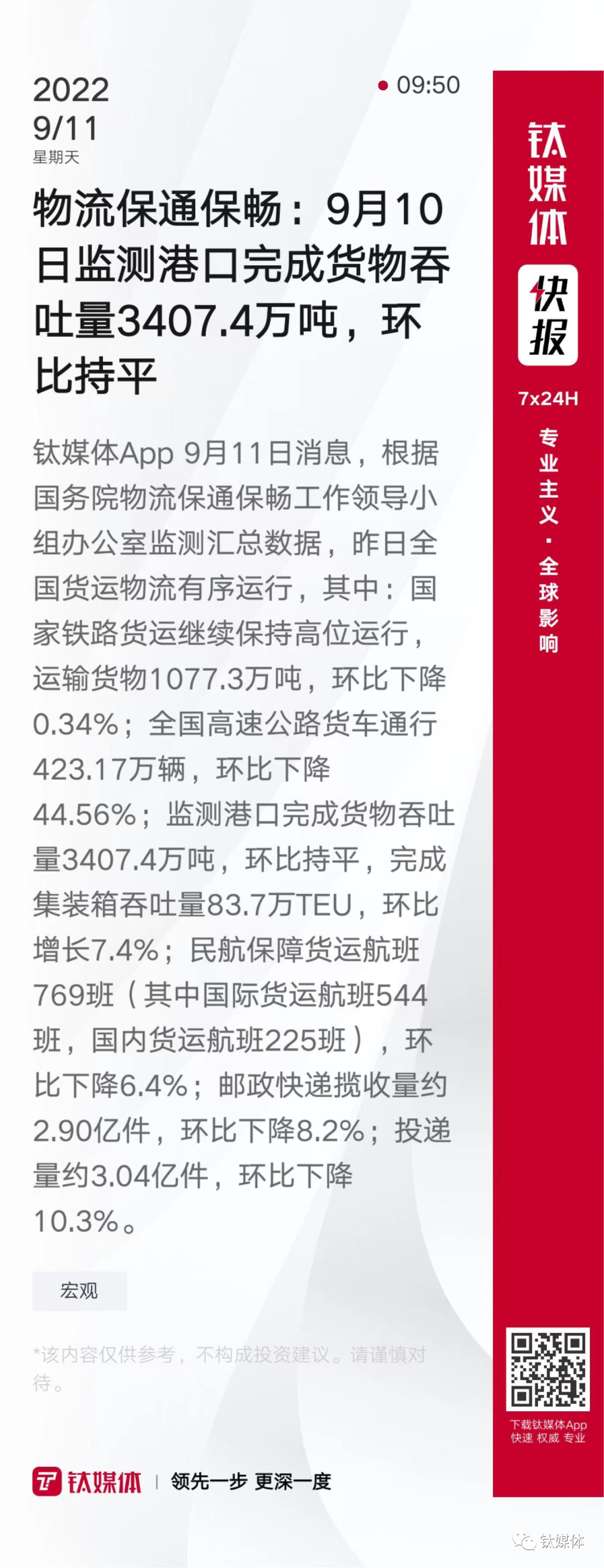 【物流保通保畅:9月10日监测港口完成货物吞吐量3407.4万吨,环比持平】