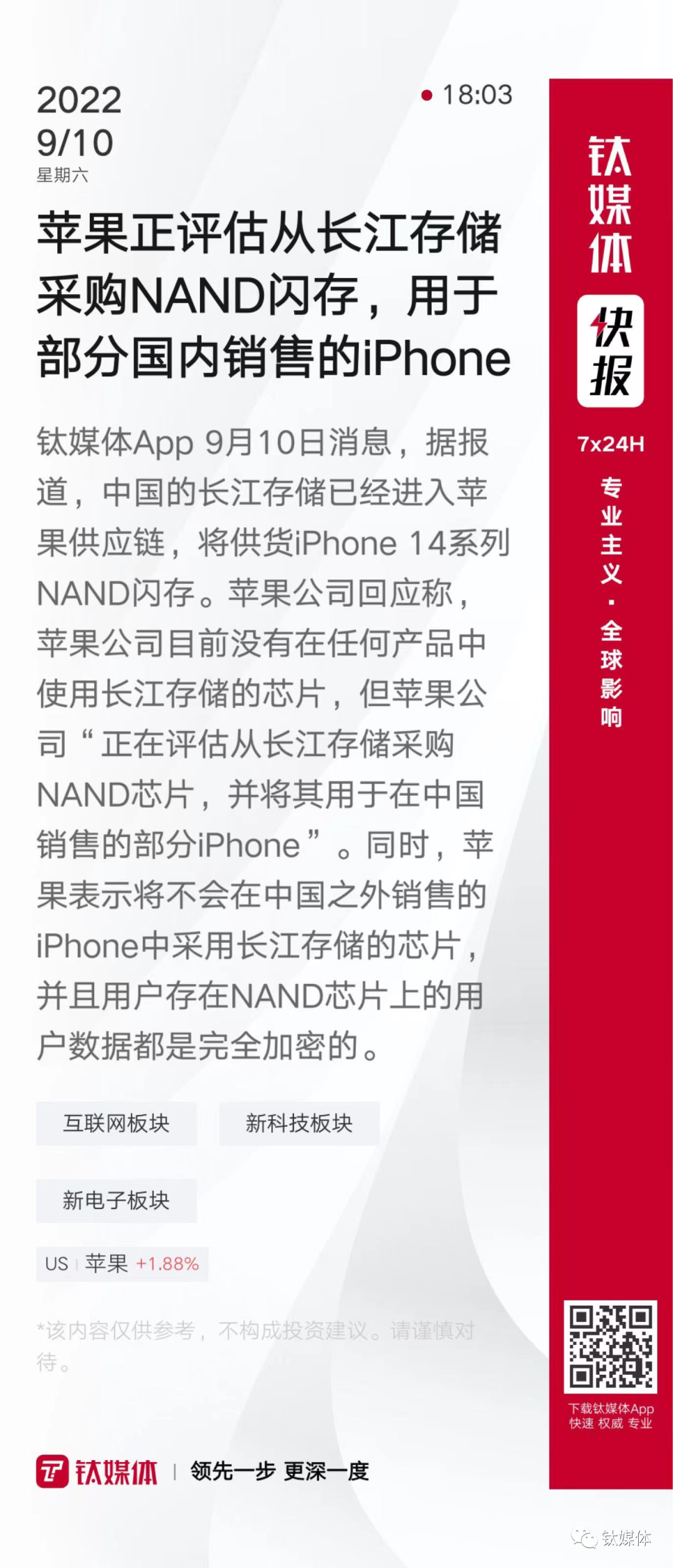 【苹果正评估从长江存储采购NAND闪存,用于部分国内销售的iPhone】