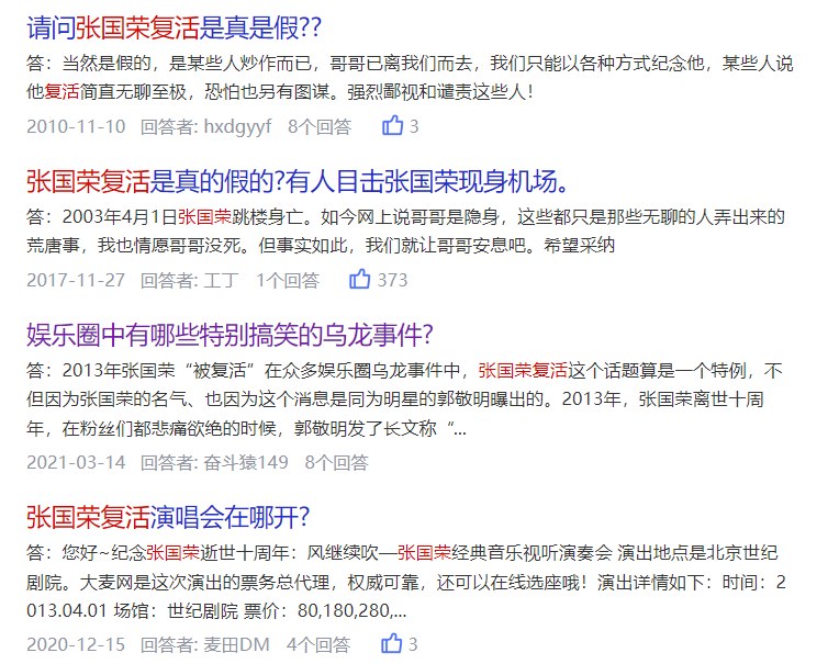 比如每年的4月1日,你除了能看到各大厂商的愚人节整活以外,还一定能看到对风华绝代的“哥哥”张国荣的缅怀,以及“张国荣复活”的谣言——2013年的时候,小四郭敬明还在这个谣言上点了把火,导致他在微博被人“炎上”。