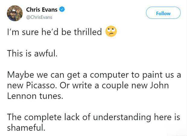 这个事件在当年几乎引起了整个电影圈的集体反对,著名超级英雄美队的扮演者克里斯·埃文斯在推特上直接嘲讽片方说“这糟透了,我们要不让电脑画一张毕加索的新画,或者写几首约翰·列侬的新歌?这种行为是可耻的。”