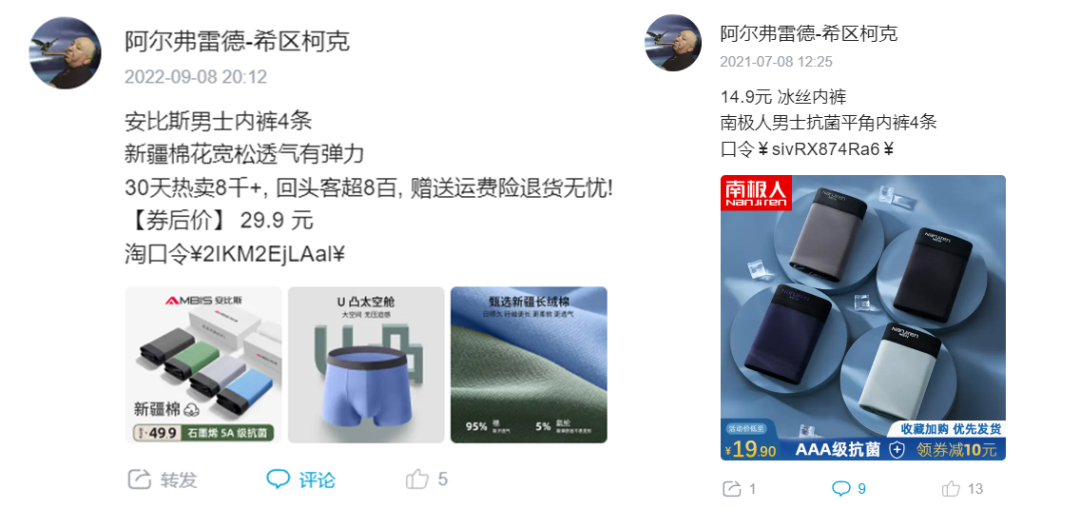 这位顶着希区柯克的名头和头像的老哥和“柯本”不同,他的整活没有个人色彩,纯粹就是个无情的带货机器,而且相当“持之以恒”——从去年七月份开始就一直默默耕耘、坚持不懈,几乎每天都要发布一条带货动态,一直到今天都未曾停歇。不仅积攒了六万多的粉丝,还收获了二十几万的赞,为我们说明了即便是整活,坚持也同样是胜利的至理名言,只不过,从他的粉丝数量和动态点赞数量来看,他大概率是被B站给限流了。