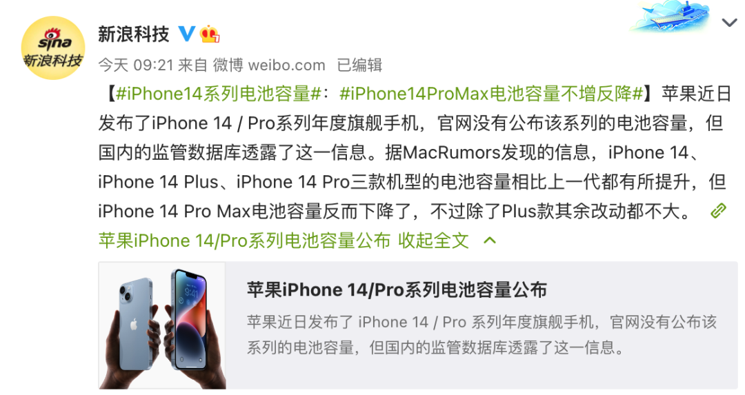近日,苹果带来了新品发布活动,全新的iPhone 14系列正式亮相。发布活动中,苹果并未对新iPhone系列进行更多的规格参数介绍,但随着新机的正式到来,更具体的产品信息也陆续出现。今天,新浪科技在最新的报道中提到,“iPhone 14、iPhone 14 Plus、iPhone 14 Pro三款机型的电池容量相比上一代都有所提升,但iPhone 14 Pro Max电池容量反而下降了,不过除了Plus款其余改动都不大。”具体的电池容量方面,这份消息中提到,iPhone 14内置 3279mAh电池,iPhone 14 Plus内置 4325mAh电池,iPhone 14 Pro内置 3200mAh电池,iPhone 14 Pro Max 内置4323mAh电池。与之对比,前代产品中iPhone 13内置3227mAh电池,iPhone 13 Pro内置3095mAh电池,iPhone 13 Pro Max内置4352mAh电池。与此同时,全新iPhone系列的电池更换价格也进行了调整。新浪科技的另一份报道显示,“苹果iPhone14/Pro系列的电池保外维修价格出炉,全系四款都是748元。这也是继iPhone X涨至519元后,iPhone新机的再次涨价。此外,Apple Watch手表的电池保外维修价格也涨了,由611元调整到648元,涨价37元。最新发布的Apple Watch Ultra维修价格更是达到了748元。”此外,除了电池方面的调整外,全新iPhone 14系列的充电能力也备受关注。在正式发布时,苹果官方并未给出具体的充电功率信息,现在最新的消息中提到了更详细的内容。据悉,目前在认证网站可以查询到全新iPhone设备的认证信息,相关推测认为其应该就是全新的iPhone 14系列。认证页面显示,几款通过认证的5G手机申请人和制造商均为美国苹果公司,设备型号为A2884、A2888、A2892、A2896。具体的充电能力方面,四款设备均支持最大 14.5VDC, 2A充电,即支持最高29W的充电功率,但不带电源适配器销售。如果这几款设备真的是全新的iPhone 14系列的话,那么该系列的充电能力应该就是最高29W。不过,实际的充电表现和数据如何,还有待后续实际的测试验证。