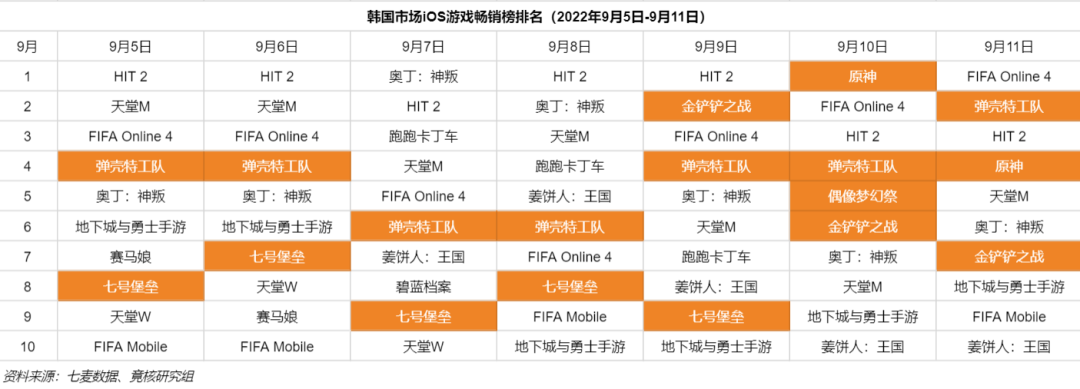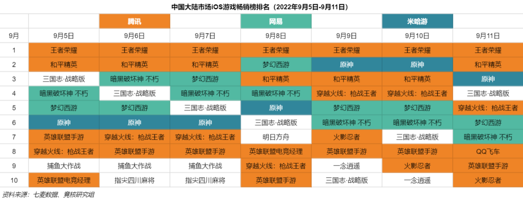2022年9月5日—9月11日韩国iOS游戏类畅销榜中,国产游戏包括网易《暗黑破坏神:不朽》、米哈游《原神》、海彼网络《弹壳特工队》、龙创悦动《7号堡垒》、腾讯《金铲铲之战》等游戏也进入Top10,集中在榜单中段。