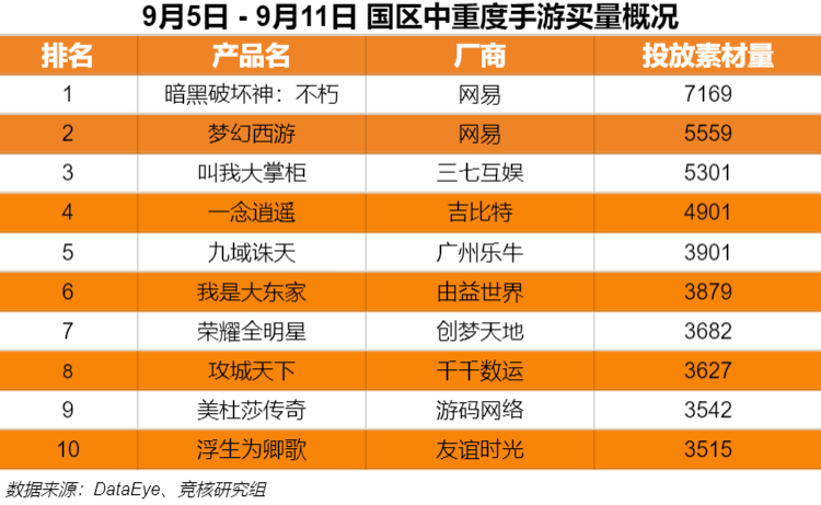 Data-Eye数据显示,2022年9月5日—9月11日国内中重度手游买量榜单中,头部厂商包括网易、三七互娱、吉比特。