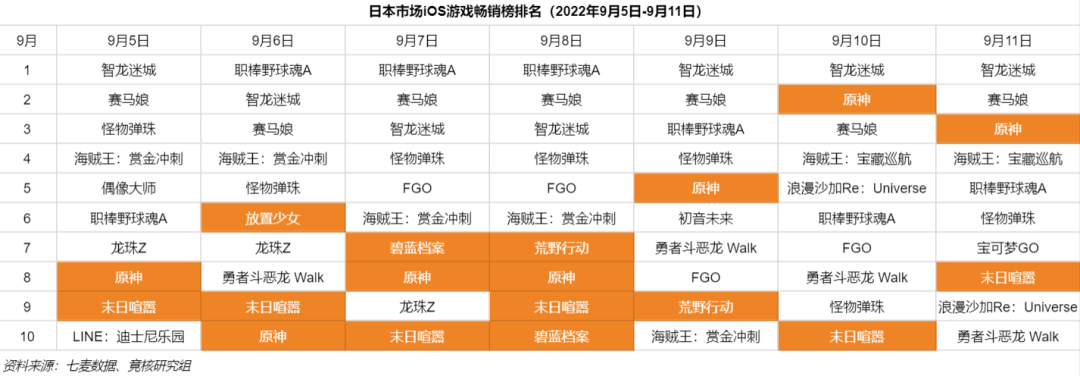 2022年9月9日—9月11 日 日本iOS游戏类畅销榜中,国产游戏包括网易《荒野行动》、米哈游《原神》、三七互娱《末日喧嚣》、悠星网络《碧蓝档案》、有爱互娱《放置少女》。