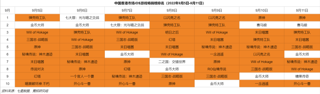 中国香港市场2022年9月5日—9月11日iOS游戏类畅销榜中,《弹壳特工队》、《以闪亮之名》、《原神》轮流登顶。