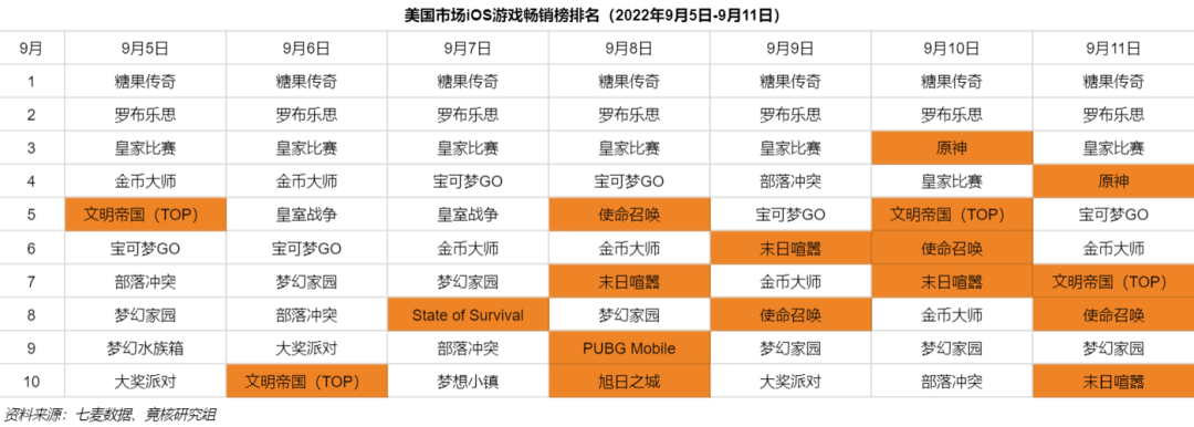 此外,本周TOP GAMES《文明帝国》、米哈游《原神》、FunPlus《State of Survival》、腾讯《使命召唤》、三七互娱《末日喧嚣》、壳木游戏《旭日之城》也进入畅销榜Top10,集中在榜单中后段。