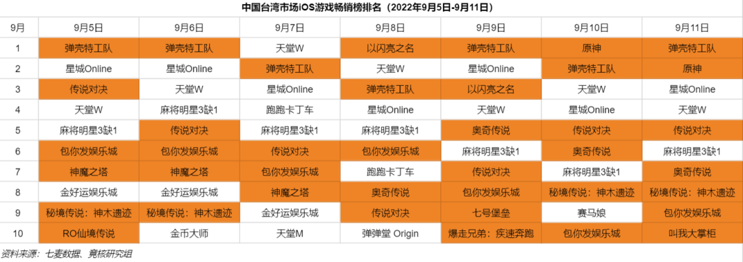 中国台湾市场2022年9月5日—9月11日iOS游戏类畅销榜中,《弹壳特工队》、《以闪亮之名》、《原神》均成功登顶。
