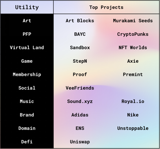 为了帮助NFT爱好者以更低的门槛访问他们想要的NFT,以及帮助高质量的NFT项目扩大他们的社区,我们将市场上的NFT项目根据其效用进行了如下分类: