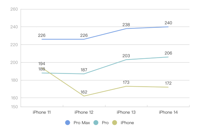 我做了一张直观的图表,从曲线变化不难看出,在过去的四年时间里,iPhone Pro系列的机身重量都是在向更重的方向发展的。机身更重的一个主要原因是镜头模组,iPhone 14 Pro系列拥有一个全新的镜头模组,不但主镜头升级了4800万像素,两颗副镜头也都做了相应的调整。全新的镜头模组拥有更大的面积,这意味着两件事:其一是在iPhone 14 Pro Max的机身保持和前一代几乎相同宽高比的前提下,机身厚度增加了0.2mm,机身内部的空间会被进一步的压缩;其二,iPhone 13 Pro Max的保护套,要下岗了。![]()
