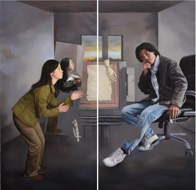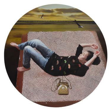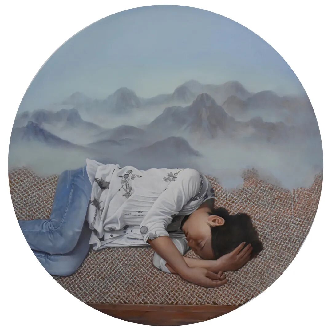 2005年,在见到一张陈旧的棕绷床后,其纵横交错的纹理与斑驳的岁月痕迹,点燃了我“恋床”系列作品创作热情。棕绷床上的繁杂线条是一种将时光织进画布的方式,寂静而冷清的背后表现的是对生命的柔情万种。此系列代表作构成了展览“澄怀萦梦”单元。