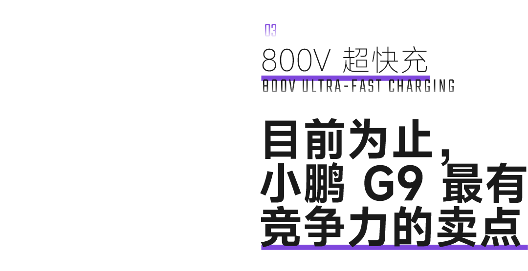 此外,在这次官网的传播文案当中,对 G9 的定义是「超快充全智能 SUV」,快充放在首位,因此董车会给大家划重点,全系标配 800V 超快充是目前 G9 最有竞争力的卖点。2019 年发布的保时捷 Taycan 是全球第一款支持 800V 高压充电的车型,几年过去后也只有极少厂商采用该技术。
