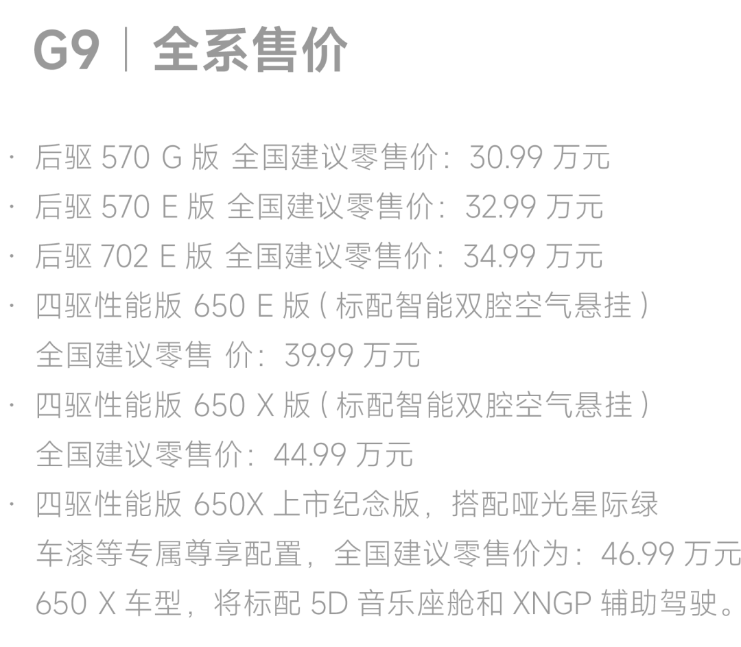2022 年 9 月 21 日,广州车展亮相 306 天后,小鹏 G9 的价格终于公布,售价区间为 30.99-46.99 万,续航覆盖 570km、650km 与 702km 版本,10 月份开启交付。对比起同代车型理想 L9 与蔚来 ES7,小鹏 G9 是发布节奏最慢的产品。然而面对外界的质疑,何小鹏 6 月曾经在微博上面表示: