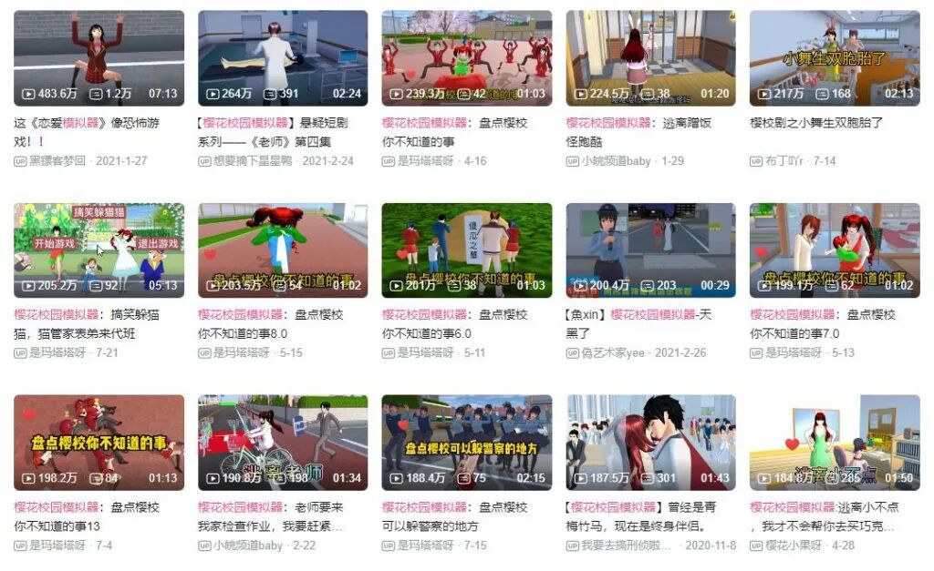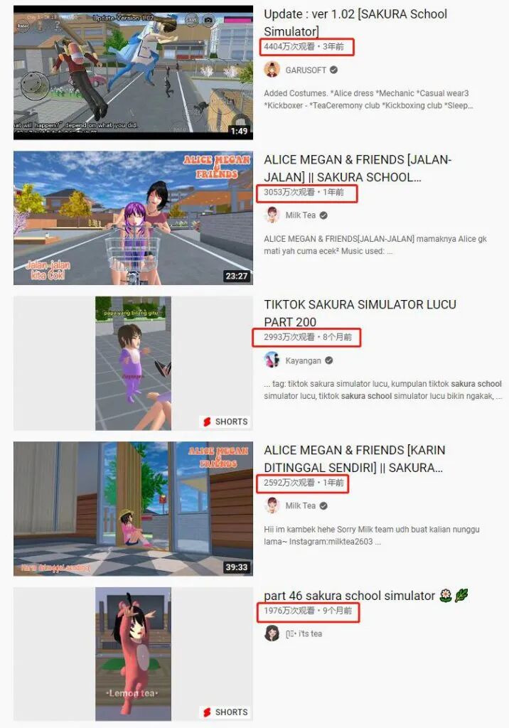 而在国外最大的视频网站Youtube上,“Sakura School”相关的UGC内容则可以用“现象级”来形容,其播放量最高的一条视频目前已经超过了4400万次,而热度最高的前3条视频的总播放量更是超过了1亿次。如此巨大的播放量衬托下,百万级播放量的视频反而显得平常。