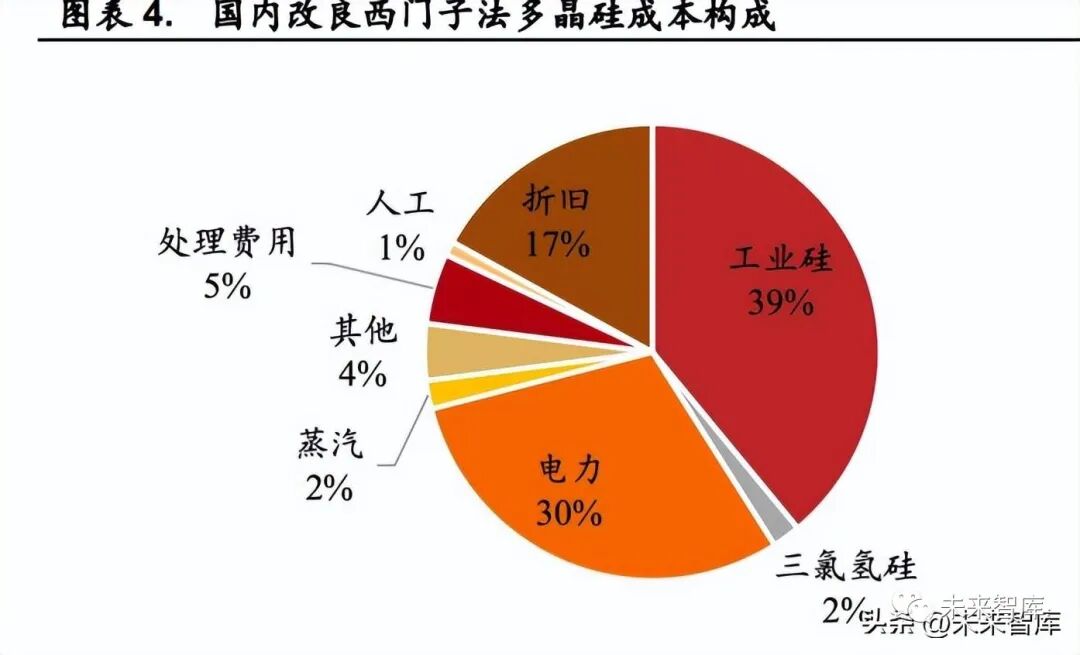 工业硅和电力是光伏硅料的成本核心。根据百川盈孚数据,2022年6月上旬国内改良西门子法生产多晶硅的成本结构中原材料占比最大,达到41%,其中工业硅占总成本的 39%,为光伏硅料的最大成本项,因此降低硅耗(生产单位多晶硅耗费的硅量)可以有效降低光伏硅料的生产成本;能源占总成本的 32%,其中电力占总成本的30%,为光伏硅料第二大成本项,进一步降低生产电价和电耗水平也成为了光伏硅料企业重要的降本途径之一。