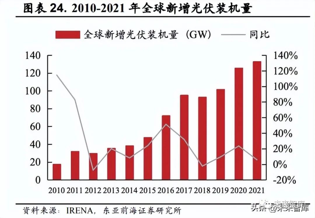 全球光伏装机量持续提升,预计 2025 年新增装机量达270-330GW。根据 IRENA 数据,在全球碳中和加速的背景下,叠加光伏发电成本持续下探,经济性不断提升,全球光伏新增装机量由2010 年的17.46GW提升至2021年的 132.81GW,CAGR 达到 20.26%。根据CPIA 预测,2025年全球新增光伏装机量将达到 270-330GW。从全球装机量分布来看,去中心化趋势较为明显,已逐渐由欧洲主导演变成中国、巴西、印度、美国等市场共同崛起的局面,根据 IEA 数据,2021 年至少有20 个国家的新增光伏装机量超过了 1GW,15 个国家的累计装机容量超过10GW,5 个国家的累计装机容量超过 40GW。