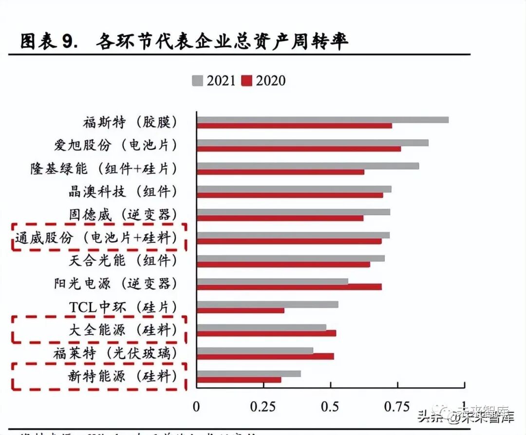 光伏硅料行业较产业链其他环节具有重资产+低周转+高ROE的特征。我们选取光伏产业链各环节的龙头代表公司与光伏硅料龙头企业进行比较,具体来看: 1)重资产:从资产结构来看,光伏硅料企业的流动资产占比整体相对偏低,低于逆变器、胶膜、组件等环节,整体资产结构较重,具备较高的准入和退出门槛; 2)低周转:从资产周转率来看,光伏硅料企业整体具有偏低的总资产周转率和固定资产周转率,低于胶膜、组件、逆变器等环节;3)高 ROE:从摊薄 ROE 来看,光伏硅料行业2021 年ROE水平大幅领先产业链其他环节,近年来随着硅料供给持续紧缺,光伏硅料环节的利润空间持续扩张。
