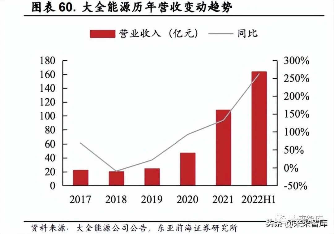 公司营收及归母净利润快速增长,太阳能电池及组件销量持续增长。2017-2021 年,公司营收增长迅速,CAGR 达24.90%;同期归母净利润CAGR为 42.12%。公司 2021 年实现营业收入 634.91 亿元,同比+43.64%,营收高速增长,主要受益于光伏行业高景气,公司多晶硅及电池片产品销量稳步上升;2021 年公司归属母公司净利润 82.08 亿元,同比+127.50%,2021年公司电池及组件销量达到 34.93GW,同比+57.61%。2022 年H1,公司实现营收 603.39 亿元,同比+127.16%;实现归母净利润122.24 亿元,同比+312.17%,主要系硅料供不应求,公司硅料产品量利齐升,助力业绩高增。