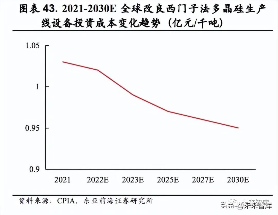 未来改良西门子技术成本仍有较大下降空间,仍将占据行业主流地位。1)投资成本:随着生产装备技术进步、单体规模提高和工艺水平提升,改良西门子法多晶硅生产线设备投资成本逐年下降,根据CPIA数据,2021年投产的万吨级改良西门子法多晶硅生产线设备投资成本在10.3亿元/万吨的水平,预计到 2030 年万吨投资成本可下降至9.5 亿元,较2021年下降7.77%; 2)还原电耗:主要包括硅芯预热、沉积、保温、结束换气等工艺过程中的电力消耗,而菜花料的使用、还原炉的大型化和棒数增加能有效降低还原电耗。目前 40 对棒还原炉为行业主流炉型,未来随着72 对棒等大炉型的投用和稳定生产、单晶厂家对于菜花料的试用、以及气体配比的不断优化,还原电耗有望进一步持续下降,根据 CPIA 预测,到2030 年多晶硅生产平均还原电耗有望下降至 42kWh/kg-Si,相较2021 年降低8.70%;3)冷氢化电耗:主要包括物料供应、氢化反应系统、冷凝分离系统和初馏系统的电力消耗。反应催化剂的开发、工艺环节中热能回收利用率的提高、以及反应效率的提高,都可以有效降低冷氢化电耗水平。根据CPIA预测,2030 年多晶硅生产冷氢化电耗有望下降至4.1kWh/kg-Si 以下,较2021年下降 12.77%; 4)综合电耗:是指多晶硅产品所耗用的全部电力,包括合成、电解制氢、精馏、还原、尾气回收和氢化等环节的电力消耗。根据CPIA预测,未来随着多晶硅企业生产装备技术提升、系统优化能力提高、以及生产规模增大,2030 年多晶硅生产综合电耗有望下降至 55kWh/kg-Si,较2021年的节省幅度达到 12.70%。